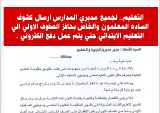 علي جميع مديري المدارس ارسال كشوف الساده المعلمون والخاص بحافز الصفوف الاولي الي التعليم الابتدائي حتي يتم عمل دفع الكتروني خلال الشهر القادم